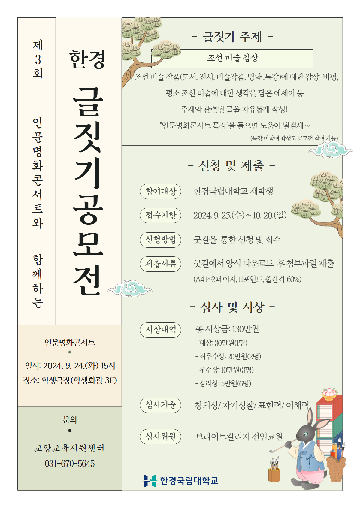 - 본 공모전 수상작의 저작권 및 소유권은 한경국립대학교 교양교육지원센터로 귀속되며 교육적 목적으로 공개 및 활용될 수 있음