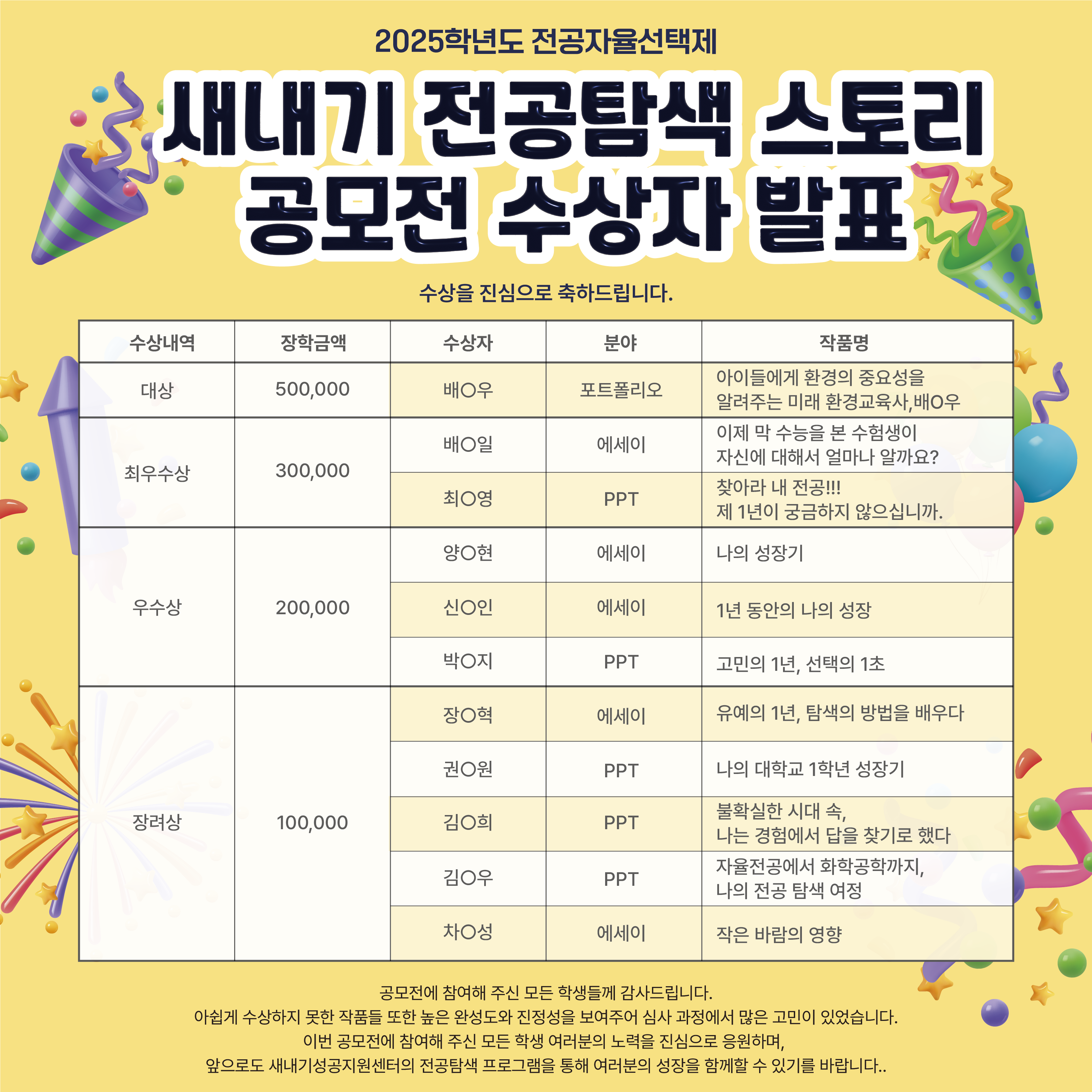 이번 공모전에 참여해 주신 모든 학생 여러분의 노력을 진심으로 응원하며, 앞으로도 새내기성공지원센터의 전공탐색 프로그램을 통해 여러분의 성장을 함께할 수 있기를 바랍니다.