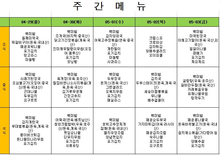 2024. 4. 29. ~ 2024. 5. 3. 주간식단표