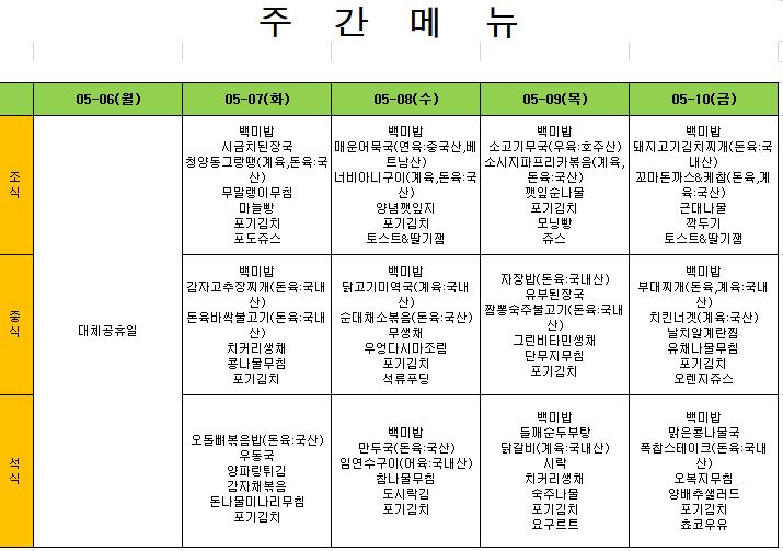 2024. 5. 6. ~ 2024. 5. 10. 주간식단표