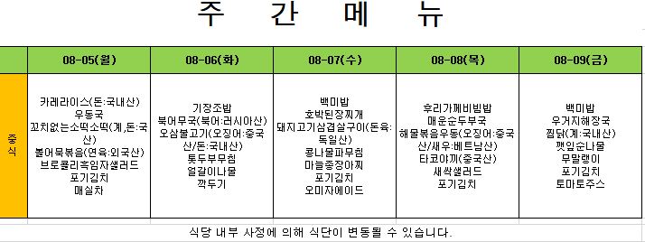 2025. 8. 4. ~ 2025. 8. 8. 주간식단표