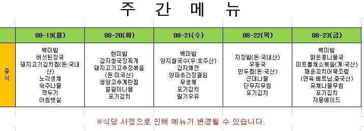 2025. 8. 4. ~ 2025. 8. 8. 주간식단표
